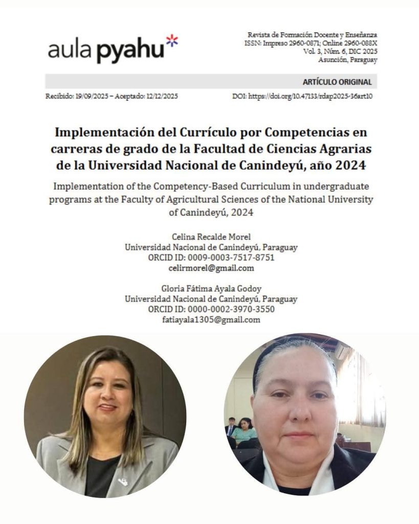 El artículo publicado lleva como título: “Implementación del Currículo por Competencias en carreras de grado de la Facultad de Ciencias Agrarias de la Universidad Nacional de Canindeyú, año 2024” y se centra en la percepción de la comunidad académica sobre la implementación del currículo por competencias en las carreras de Ingeniería Agronómica y Administración Agropecuaria de la Facultad de Ciencias Agrarias de la Universidad Nacional de Canindeyú (UNICAN), durante el año 2024.
