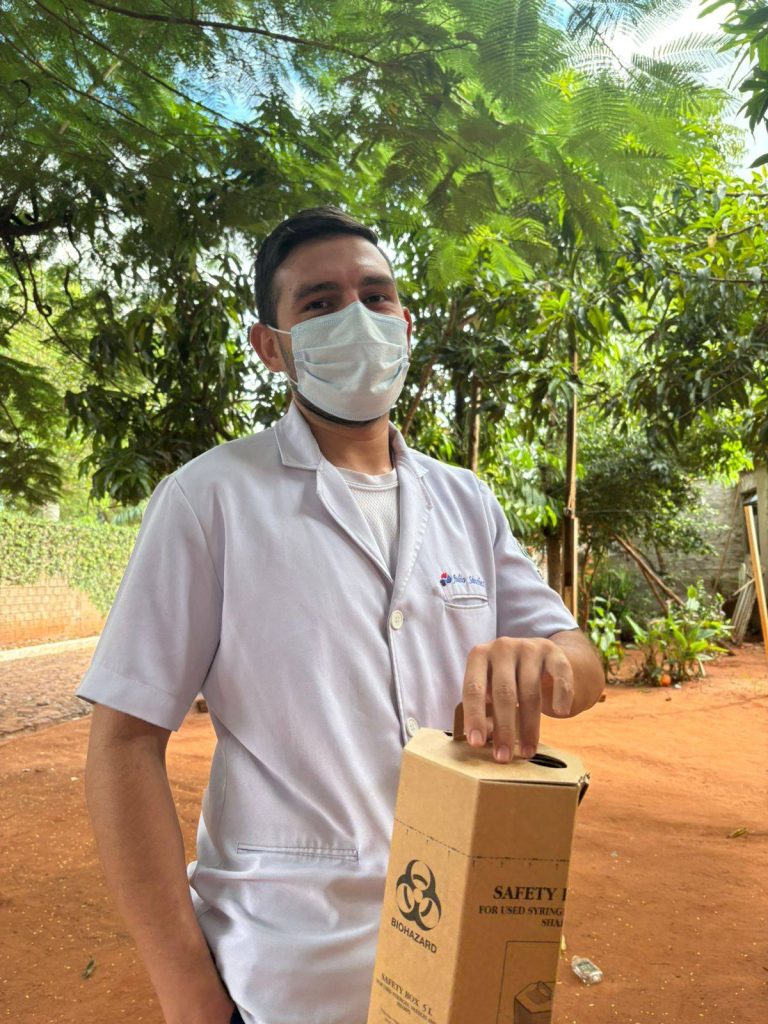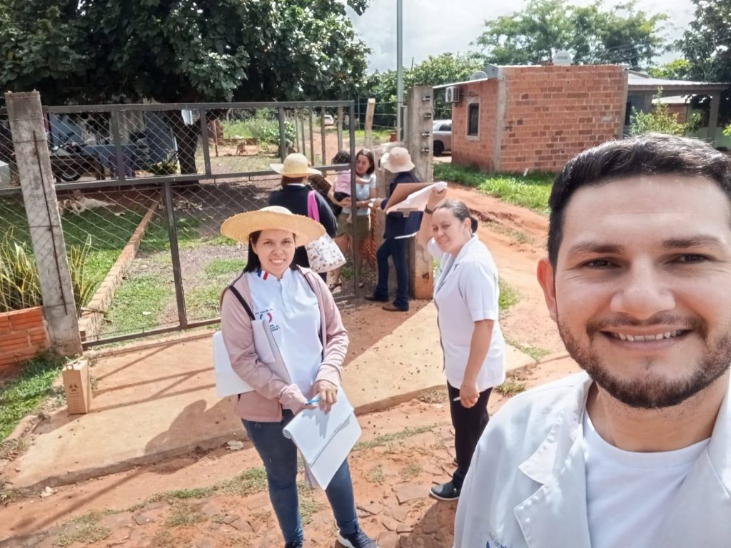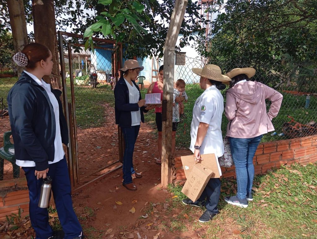 Estudiantes del cuarto curso de la Carrera de enfermería de la Facultad de Ciencias de la Salud de la Universidad Nacional de Canindeyú, acompañados por su instructor de Práctica Profesional III Área Salud Pública, el Lic. Marcelo Sánches y enfermeros de la USF Cafetal Guaraní, participaron en la campaña de vacunación contra el sarampión. Durante la jornada se realizó un recorrido por los barrios de Km 5 con el objetivo de inmunizar a niños de 1 a 5 años de edad, fortaleciendo la prevención y el cuidado de la salud infantil en la comunidad.